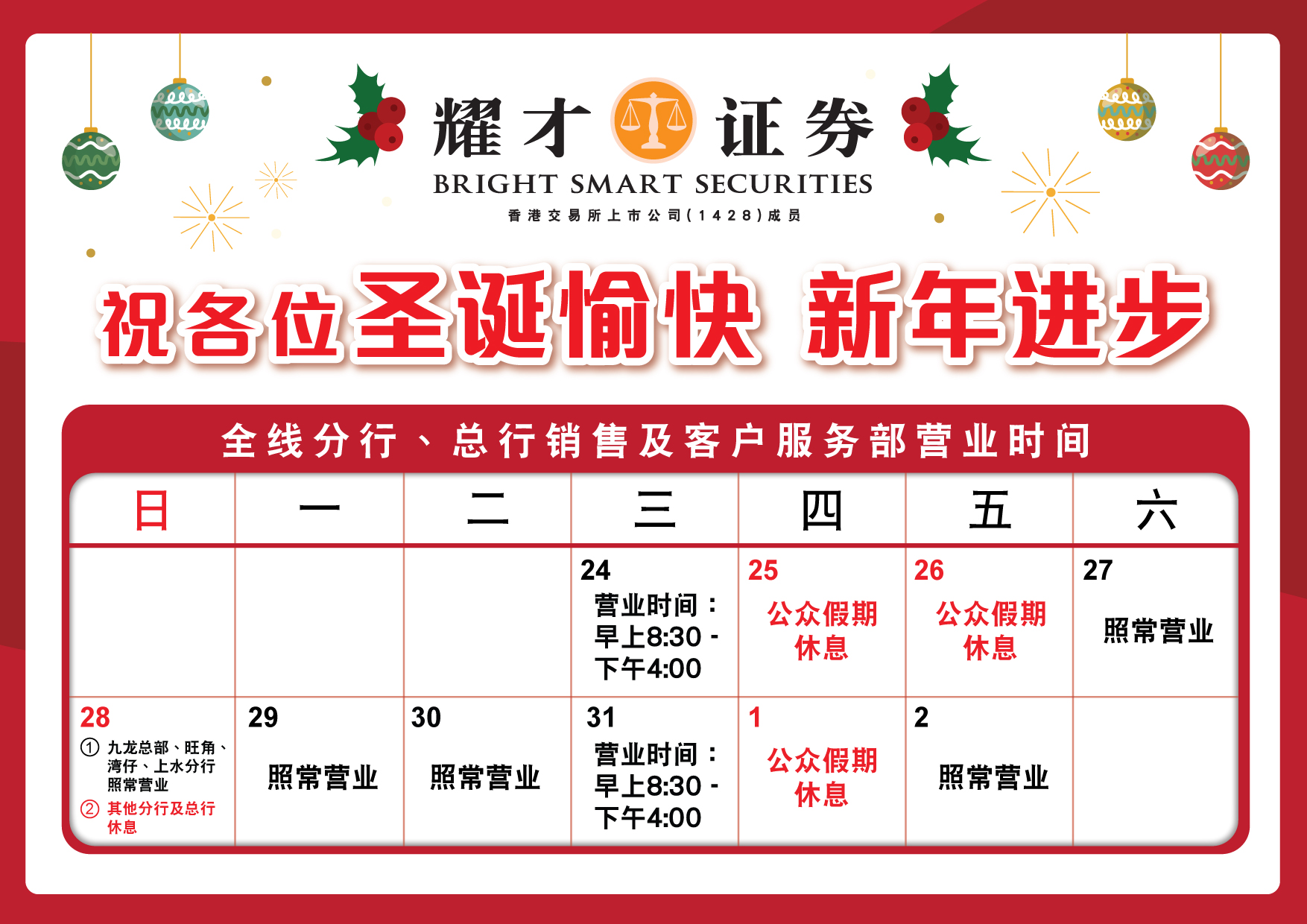 由于圣诞节前夕 (2025年12月24日) 及新年前夕 (2025年12月31日),香港交易所均不设下午交易时段,本集团全线分行,总行销售及客户服务部营业时间如下: